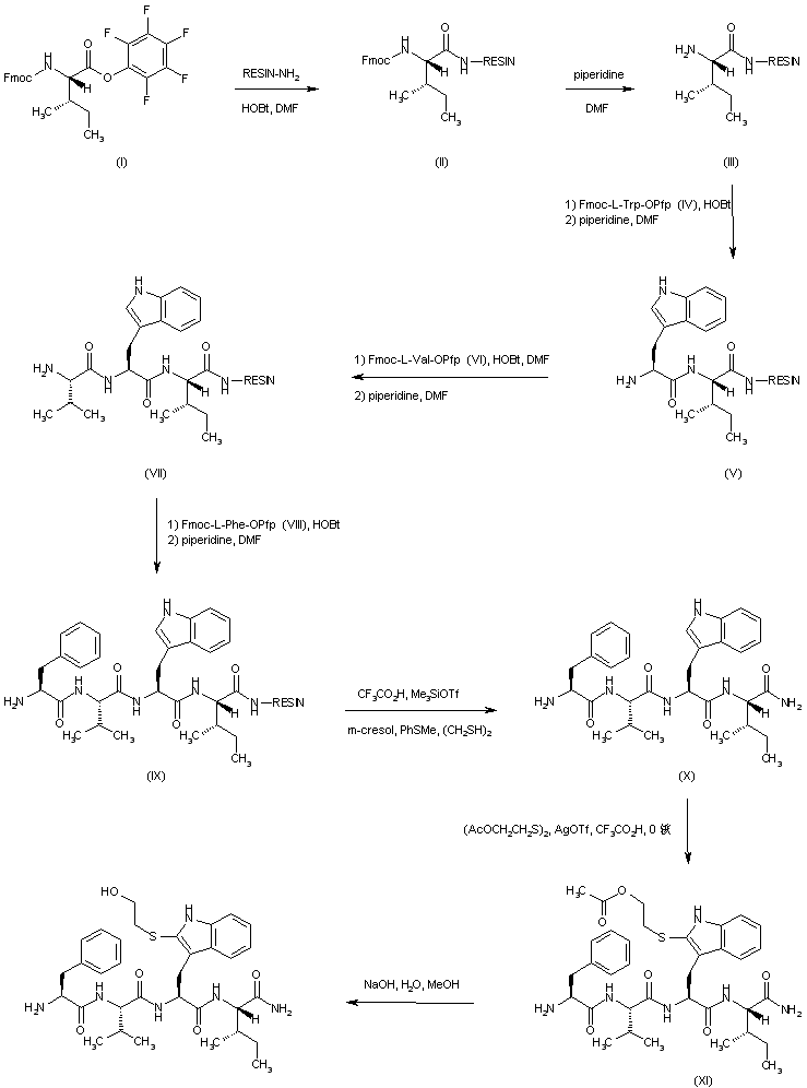 N-Fmoc-L-Isoleucine pentafluorophenyl ester (I) is attached to p-methylbenzhydrylamine resin in the presence of HOBt in DMF to provide the protected isoleucine-bound resin (II). Removal of the N-Fmoc protecting group of (II) is then effected by treatment with piperidine in DMF, to furnish the free amine (III). Subsequent coupling of (III) with N-Fmoc-L-tryptophan pentafluorophenyl ester (IV), followed by deprotection with piperidine/DMF affords the dipeptide resin (V). Further coupling and deprotection cycles with N-Fmoc-L-valine-OPfp (VI) and with N-Fmoc-L-phenylalanine-OPfp (VIII) lead to the peptide resins (VII) and (IX), respectively. Cleavage of resin (IX) to furnish the tetrapeptide amide (X) is accomplished by treatment with trifluoroacetic acid and trimethylsilyl triflate. Then, sulfanylation of the indole ring of (X) with bis-(2-acetoxyethyl) disulfide in the presence of silver triflate produces indolyl sulfide (XI). The acetate ester group of (XI) is finally hydrolyzed under alkaline conditions to furnish the title compound