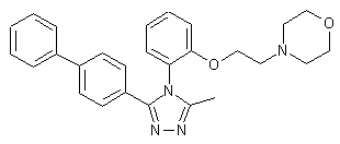 The reaction of 2-(benzyloxy)aniline (I) with acetic anhydride and pyridine gives the acetanilide (II), which is treated with P2S5 in hot toluene to yield the thioacetamide (III). The reaction of (III) with methyl iodide and K2CO3 in hot acetonitrile affords the methylated thioimidate (IV), which is cyclized with biphenyl-4-carbohydrazide (V) in hot DMF to provide 4-(2-benzyloxyphenyl)-3-(4-biphenylyl)-5-methyl-4H-1,2,4-triazole (VI). The hydrogenation of (VI) with H2 over Pd/C in methanol gives the corresponding phenol (VII), which is finally alkylated by means of 4-(2-chloroethyl)morpholine (VIII) and NaH in hot DMF to yield the target triazole. (1,2)