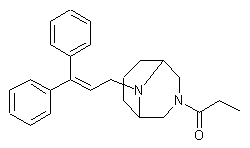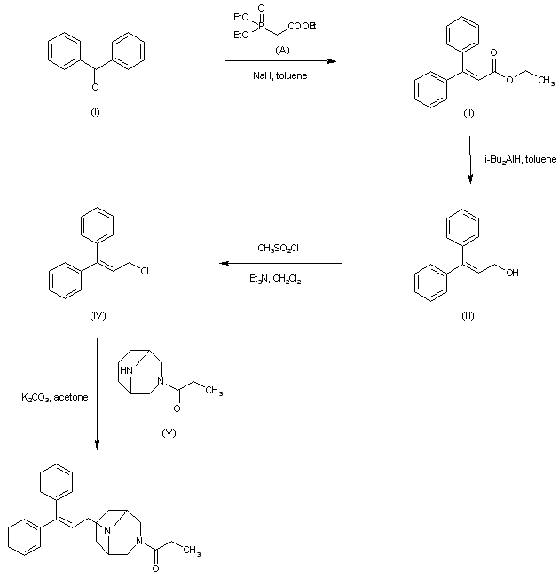 Horner-Emmons condensation of benzophenone (I) with triethyl phosphonoacetate provides the unsaturated ester (II), which is further reduced with DIBAL in toluene to the allylic alcohol (III). Reaction of alcohol (III) with methanesulfonyl chloride and Et3N leads to chloride (IV). Finally, alkylation of 3-propionyl-3,9-diazabicyclo[3.3.1]nonane (V) with the allyl chloride (IV) furnishes the title compound.