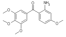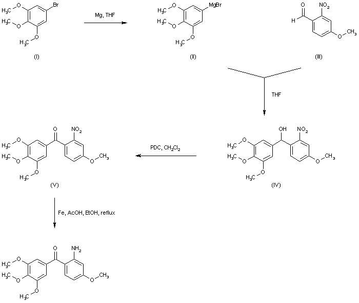 Treatment of 3,4,5-trimethoxybromobenzene (I) with Mg in THF produces the corresponding Grignard reagent (II), which is condensed with 4-methoxy-2-nitrobenzaldehyde (III) to furnish the benzhydrol derivative (IV). Oxidation of benzhydrol (IV) by means of pyridinium dichromate leads to benzophenone (V). The nitro group of (V) is then reduced to the corresponding amine employing iron powder in AcOH.