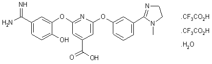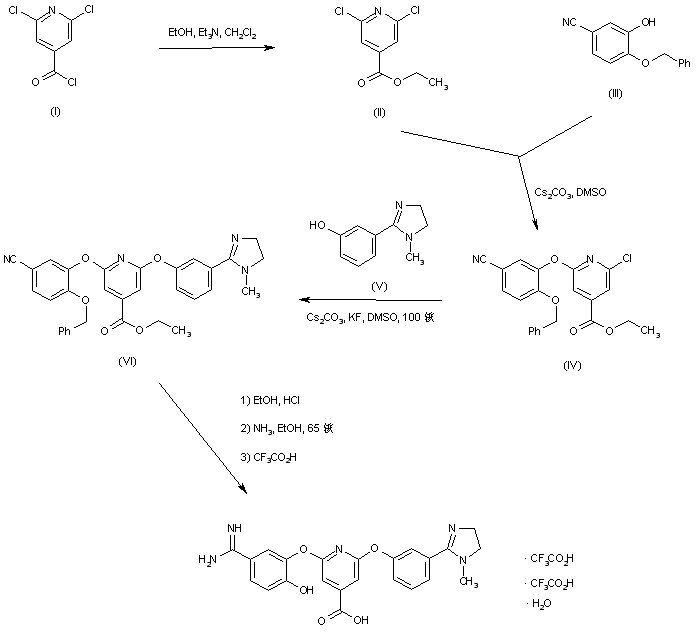 2,6-Dichloropyridine-4-carbonyl chloride (I) is reacted with ethanol and triethylamine to produce the ethyl ester (II). Subsequent displacement of one chloride group of (II) with 5-cyano-2-(benzyloxy)phenol (III) in the presence of Cs2CO3 in DMSO affords the diaryl ether (IV). The remaining chloride group of (IV) is then displaced with the imidazoline phenol (V), yielding the bis(aryloxy) pyridine (VI). Conversion of the cyano group of (VI) into the target amidine is accomplished under standard Pinner conditions. The title compound is finally purified by reversed-phase preparative HPLC in the presence of trifluoroacetic acid, producing the title bis-trifluoroacetate salt.