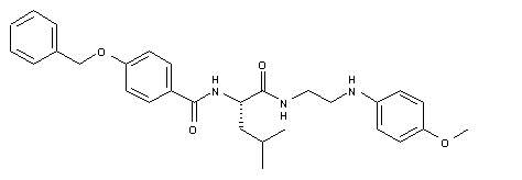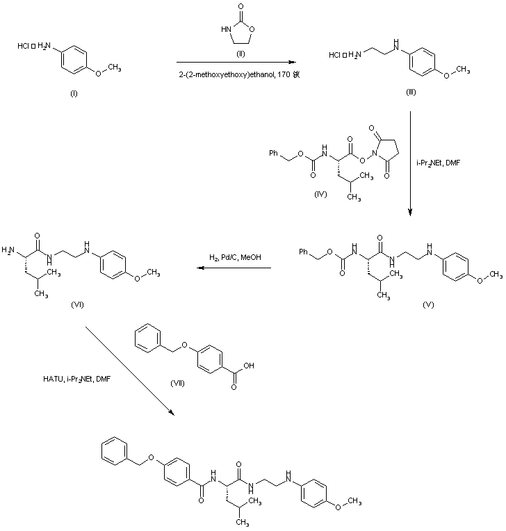 Condensation of p-anisidine (I) with 2-oxazolidinone (II) in hot 2-(2-methoxyethoxy)ethanol affords the N-aryl ethanediamine (III). This is then coupled with the succinimidyl ester of N-Z-L-leucine (IV) to furnish amide (V). The N-carbobenzoxy group of (V) is further removed by catalytic hydrogenation, providing amine (VI), which is finally acylated by 4-(benzyloxy)benzoic acid (VII) by means of HATU to yield the title compound.
