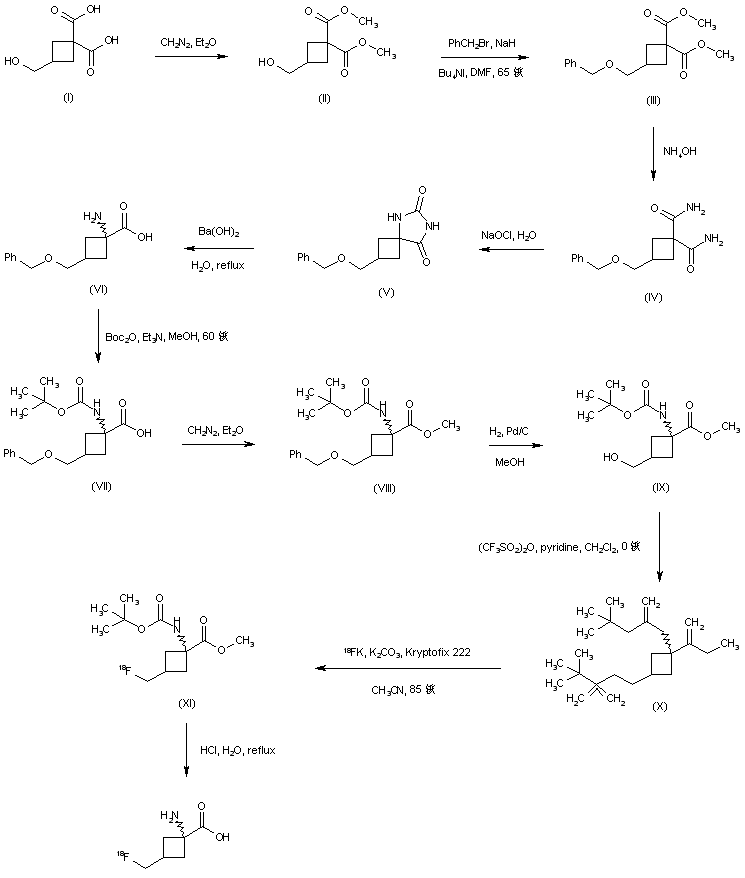 3-(Hydroxymethyl)cyclobutane-1,1-dicarboxylic acid (I) is converted into the dimethyl ester (II) upon treatment with an Et2O solution of diazomethane. The hydroxyl group of (II) is subsequently protected as the benzyl ether (III) by means of benzyl bromide in the presence of NaH and Bu4NI. Aminolysis of (III) with aqueous ammonia produces diamide (IV). Treatment of (IV) with NaOCl under Hofmann rearrangement conditions produces hydantoin (V) as a diastereomeric mixture. Further hydrolysis of (V) employing Ba(OH)2 leads to aminoacid (VI). After protection of the amino group as the N-Boc derivative (VII), treatment with diazomethane in Et2O furnishes the N-Boc amino ester (VIII). The O-benzyl group of (VIII) is then removed by hydrogenolysis over Pd/C, producing alcohol (IX), which is further reacted with trifluoromethanesulfonic anhydride and pyridine to yield triflate (X). Displacement of the triflate group with [18F]-potassium fluoride in the presence of K2CO3 and Kryptofix affords the [18F]-labeled fluoride (XI). Finally, hydrolysis of the methyl ester and N-Boc groups of (XI) under acidic conditions gives rise to the target radiofluorinated aminoacid as a diastereomeric mixture.