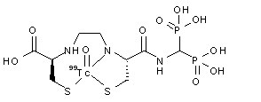 | 合成路线图解说明: Alkylation of the sodium derivative of 1,2-ethylene dicysteine (I) with benzyl chloride in liquid ammonia affords the S,S'-dibenzyl compound (II). Subsequent protection of the amino groups of (II) with benzyl chloroformate provides the bis-carbamate (III). Esterification of diacid (III) with one equivalent of MeOH in the presence of DCC and DMAP furnishes the mono-methyl ester (IV). This is then coupled with 1-aminomethylenediphosphonic acid tetraethyl ester (V) to yield amide (VI). The ethyl phosphonate ester groups of (VI) are selectively cleaved by means of trimethylsilyl bromide, producing diphosphonic acid (VII). Further hydrolysis of the methyl carboxylate ester group of (VII) under basic conditions leads to acid (VIII). Then, simultaneous removal of the S-benzyl and N-Cbz protecting groups of (VIII) is accomplished by means of Na in liquid ammonia to furnish dithiol (IX). This is finally complexed with [99mTc] sodium pertechnetate in the presence of SnCl2 to produce the target technetium conjugate. |