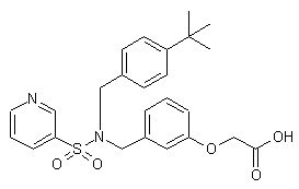 Alkylation of 3-hydroxybenzaldehyde (I) with t-butyl bromoacetate (II) affords t butyl (3-formylphenoxy)acetate (III). Aldehyde (III) is then converted to oxime (IV) upon treatment with hydroxylamine in MeOH. Reduction of oxime (IV) to the benzylic amine (V) is carried out by catalytic hydrogenation in the presence of Raney nickel. Subsequent reductive alkylation of amine (V) with 4-t-butylbenzaldehyde (VI) furnishes the secondary amine (VII). This is then acylated by pyridine-3-sulfonyl chloride (VIII) producing sulfonamide (IX). The t-butyl ester group of (IX) is finally cleaved with trifluoroacetic acid to give the corresponding carboxylic acid.