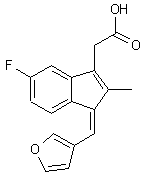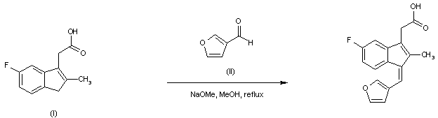 The title compound is prepared by condensation between 5-fluoro-2-methylindene-3-acetic acid (I) and 3-furaldehyde (II) in the presence of NaOMe.