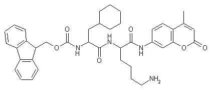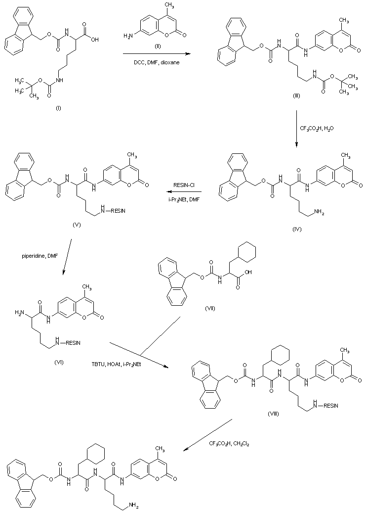 Coupling of N-alpha-Fmoc-N-epsilon-Boc-lysine (I) to 7-amino-4-methylcoumarin (II) by means of DCC produces the lysine amide (III). After acidic cleavage of the N-Boc protecting group of (III), the resultant primary amine (IV) is attached to chlorotrityl resin to produce (V). The Fmoc group of (V) is then removed with piperidine in DMF, yielding the lysinamide-bound resin (VI). Further coupling with N-Fmoc-cyclohexylalanine (VII) employing TBTU/HOAt furnishes the dipeptide amide resin (VIII). The title compound is finally cleaved from the solid support by means of trifluoroacetic acid in CH2Cl2.