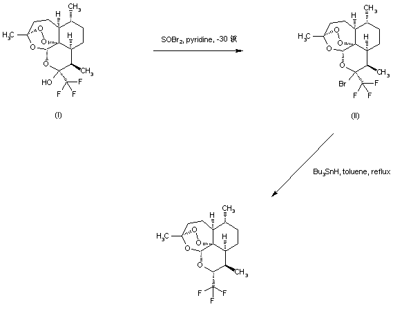 The known trifluoromethyl derivative of artemisinin (I) is brominated with SOBr2 in the presence of pyridine at -30 C to furnish stereoselectively bromide (II). Subsequent reductive dehalogenation of (II) employing tributyltin hydride leads to the title compound.