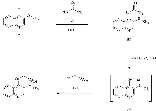 Condensation of 4-chloro-3-(methylsulfanyl)quinoline (I) with selenourea (II) affords the quinolinyl iso-selenourea (III). Basic hydrolysis of (III), followed by alkylation of the intermediate selenide (IV) with propargyl bromide (V) provides the target propargyl selenoquinoline.