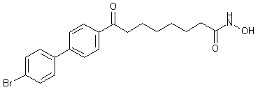 The reaction of ethyl 7-bromoheptanoate (I) with NaI, Zn, dibromoethane, LiCl and CuCN gives the organometallic derivative (II), which is condensed with 4-bromobenzoyl chloride (III) in THF to yield 8-(4-bromophenyl)-8-oxooctanoic acid ethyl ester (IV). The condensation of (IV) with 4-bromophenylboronic acid (V) by means of Pd(PPh3)4 and K2CO3 in hot toluene affords 8-(4'-bromobiphenyl-4-yl)-8-oxooctanoic acid ethyl ester (VI), which is hydrolyzed with NaOH in THF/methanol to provide the corresponding carboxylic acid (VII). Finally, this compound is treated with hydroxylamine, EDC, HOBt and TEA to obtain the target hydroxamic acid.