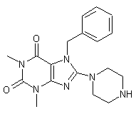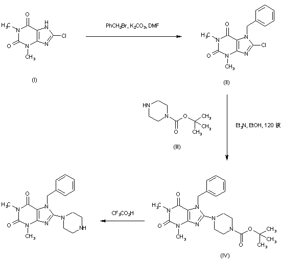 Alkylation of 8-chloro-1,3-dimethylxanthine (I) with benzyl bromide and K2CO3 affords the 7-benzyl purine (II). This is then condensed with N-Boc-piperazine (III) in EtOH upon heating at 120 C in a sealed vessel to provide the 8-piperazinyl derivative (IV). Finally, deprotection of (IV) employing trifluoroacetic acid leads to the title compound