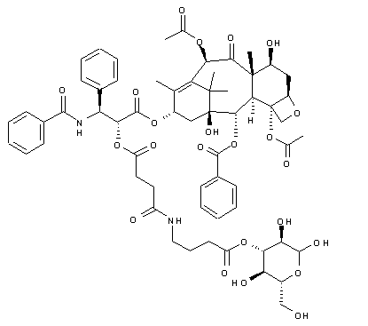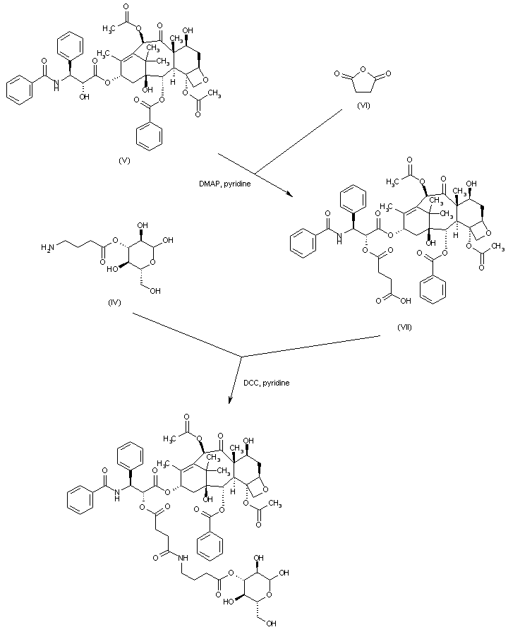 Condensation of paclitaxel (V) with succinic anhydride (VI) affords the hemisuccinate ester (VII). This is subsequently coupled with amino ester (IV) in the presence of DCC to furnish the title compound.