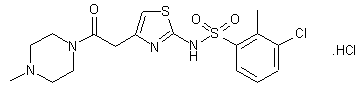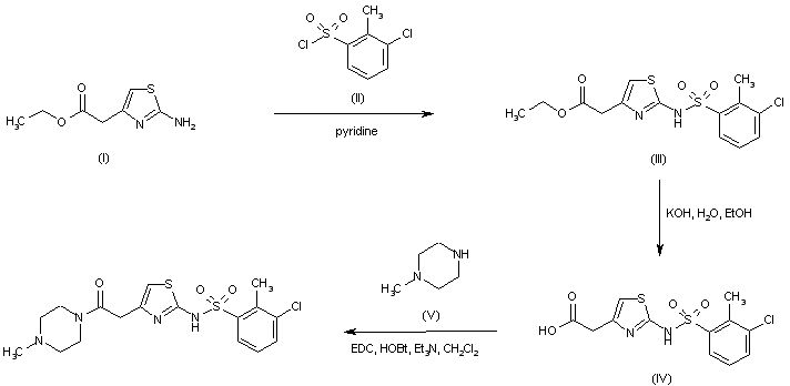 Acylation of ethyl 2-amino-4-thiazolylacetate (I) with 3-chloro-2-methylbenzenesulfonyl chloride (II) in pyridine affords sulfonamide (III). After alkaline hydrolysis of the ethyl ester group of (III), the resultant carboxylic acid (IV) is coupled to N-methylpiperazine (V) by means of EDC to furnish the target amide.