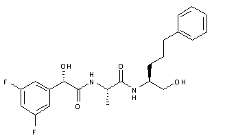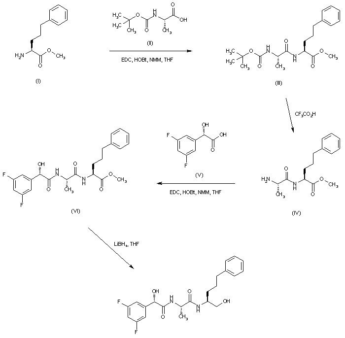 | 合成路线图解说明: Coupling between methyl 2-amino-5-phenylpentanoate (I) and N-Boc-alanine (II) affords dipeptide (III). Deprotection of (III) with trifluoroacetic acid yields amine (IV), which is then acylated with (S)-3,5-difluoromandelic acid (V), producing amide (VI). Finally, ester group reduction using LiBH4 leads to the desired alcohol. |