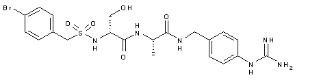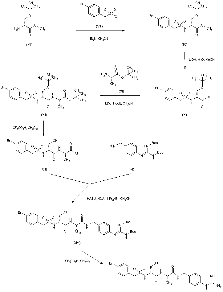 Acylation of O-t-butyl-D-serine methyl ester (VII) with sulfonyl chloride (VIII) yields sulfonamide (IX). After saponification of the methyl ester group of (IX) employing LiOH, the resultant carboxylic acid (X) is coupled to L-alanine t-butyl ester (XI) to furnish the sulfonyl dipeptide (XII). Acidic cleavage of the t-butyl ester group of (XII) gives rise to the carboxylic acid (XIII). This is then coupled to the benzylic amine (VI) to afford amide (XIV). Finally, the N-Boc protecting groups of (XIV) are removed by treatment with trifluoroacetic acid in CH2Cl2. (1,2)