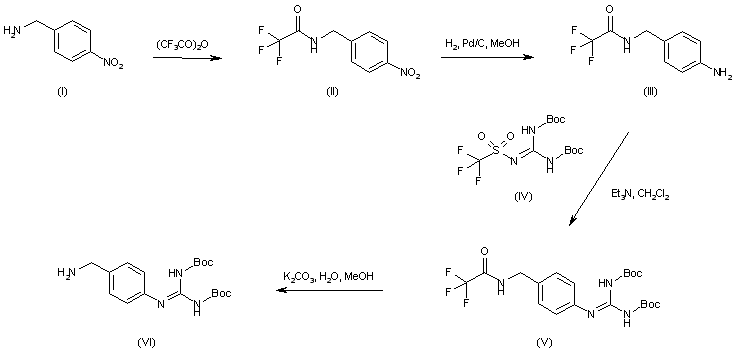 4-Nitrobenzylamine (I) is protected as the corresponding trifluoroacetamide (II) and subsequently reduced to aniline (III) by catalytic hydrogenation over Pd/C. Condensation of (III) with N,N'-di-Boc-N''-(trifluoromethanesulfonyl)guanidine (IV) furnishes the Boc-protected guanidine (V). The trifluoroacetamide function of (V) is then hydrolyzed by means of K2CO3 in aqueous MeOH to provide amine (VI). (1,2)