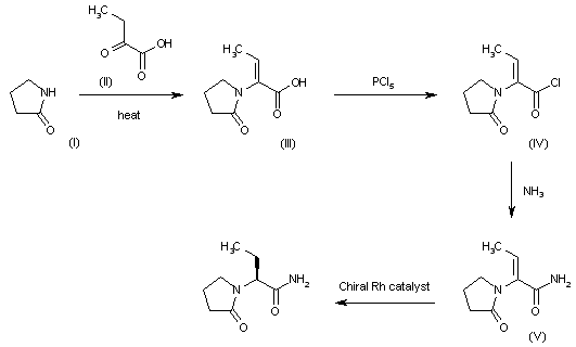 The condensation of 2-pyrrolidone (I) with 2-oxobutyric acid (II) in refluxing toluene gives 2-(2-oxopyrrolidin-1-yl)-2-butenoic acid (III), which is treated with PCl5 in THF to yield the acyl chloride (IV). The reaction of (IV) with dry ammonia affords the corresponding amide (V), which is finally submitted to an asymmetric hydrogenation with H2 over a chiral Rh catalyst to provide the desired chiral butyramide.
