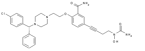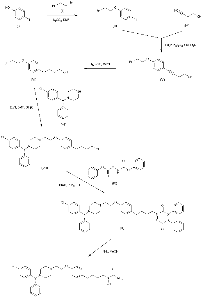 A related method for the synthesis of the title compound has been reported. After esterification of 5-iodosalicylic acid (I), the methyl ester (II) is reacted with 1,2-dibromoethane to give bromide (III). Coupling of aryl iodide (III) with 3-butyn-1-ol (IV) leads to adduct (V). Displacement of bromide (V) with (R)-p-chlorobenzhydryl piperazine (VI) furnishes piperazine (VII). Then, ester group ammonolysis in (VII) leads to amide (VIII). Coupling of alcohol (VIII) with phenoxycarbonylamino phenoxyformate (IX) under Mitsunobu conditions furnishes the protected N-hydroxy carbamate (X). Finally, treatment of (X) with methanolic ammonia provides the desired N-hydroxyurea derivative