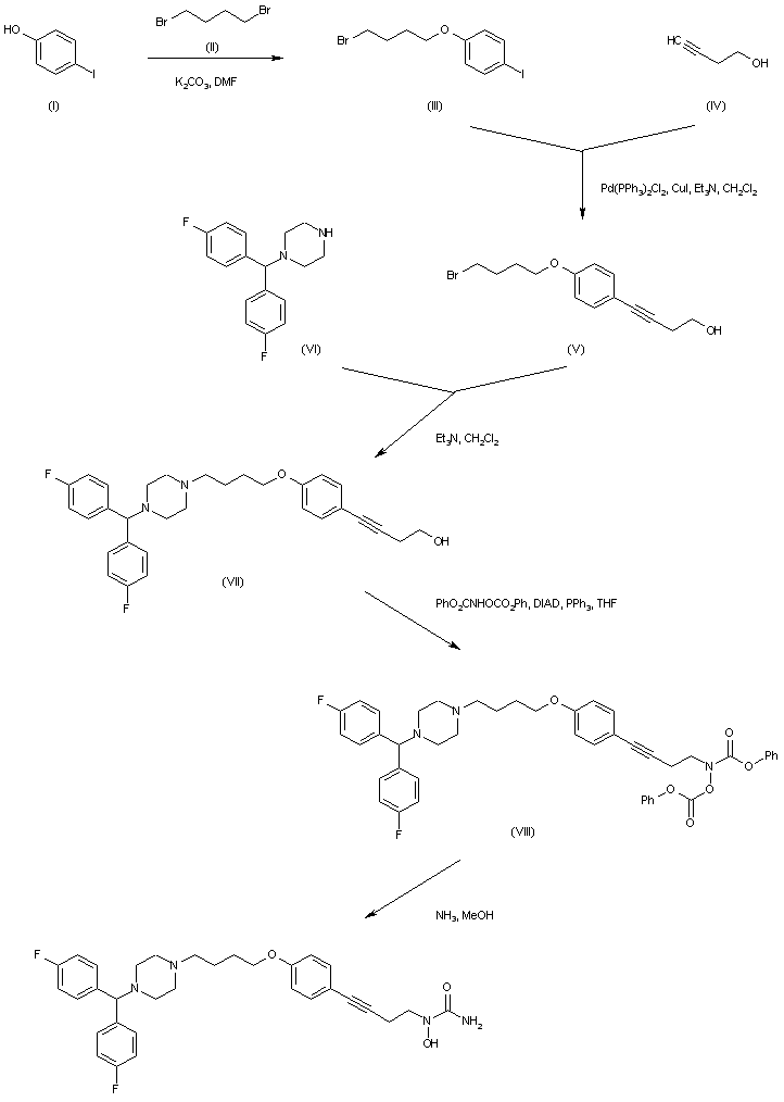 4-Iodophenol (I) is alkylated with 1,2-dibromoethane (II) to afford 1-(2-bromoethoxy)-4-iodobenzene (III). Subsequent palladium-catalyzed coupling of aryl iodide (III) with 3-butyn-1-ol (IV) furnishes the phenylbutynol adduct (V), which is further hydrogenated in the presence of Pd/C to the saturated alcohol (VI). Condensation of the alkyl bromide (VI) with (R)-p-chlorobenzhydrylpiperazine (VII) produces the dialkylated piperazine (VIII). Then, Mitsunobu coupling of arylbutanol (VIII) with phenoxycarbonylaminophenoxyformate (IX) leads to the protected hydroxamic acid (X). This is finally treated with methanolic ammonia to provide the title N-hydroxyurea derivative.