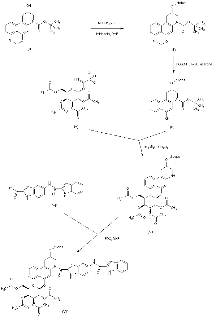 The benzoquinolinol derivative (I) is protected as the silyl ether (II) upon treatment with tert-butyldiphenylsilyl chloride and imidazole. Transfer hydrogenolysis of the benzyl ether group of (II) with ammonium formate and Pd/C affords phenol (III). This is then coupled with the trichloroacetimidate of tetraacetylgalactose (IV) in the presence of boron trifluoride etherate to produce the Boc-deprotected galactopyranoside (V). Acylation of (V) with the bis-indolylcarboxylic acid (VI) yields amide (VII).