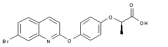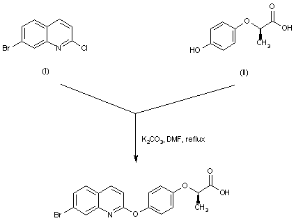 The title diaryl ether is prepared by condensation between 7-bromo-2-chloroquinoline (I) and (R)-2-(4-hydroxyphenoxy)propionic acid (II) in the presence of K2CO3 in hot DMF.