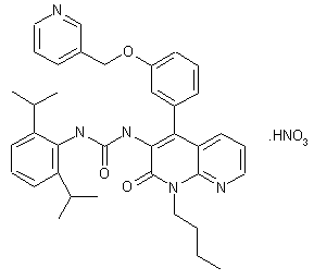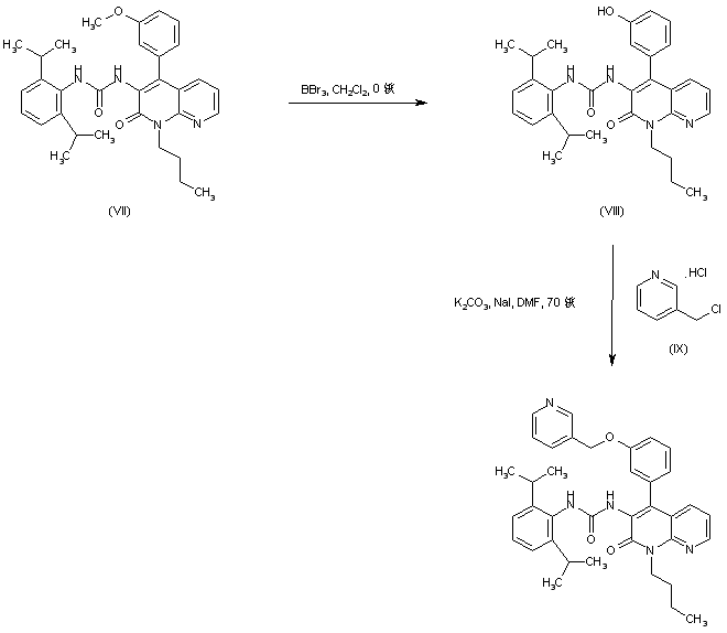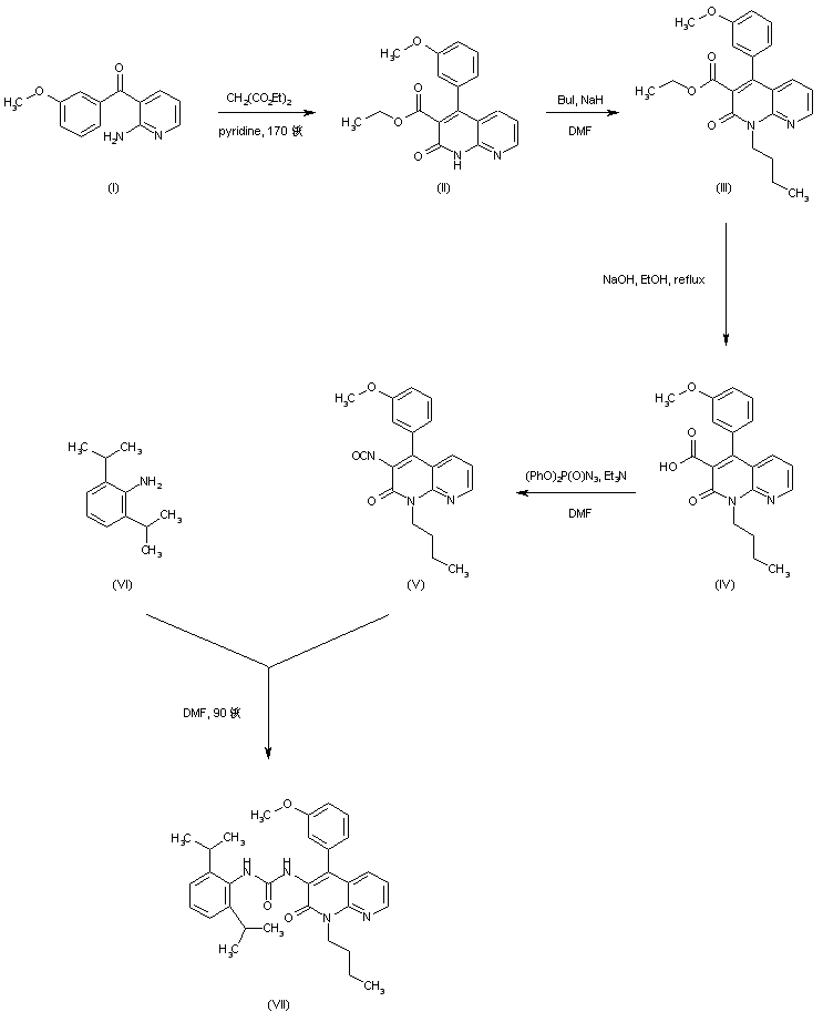 Condensation of 2-amino-3-(3-methoxybenzoyl)pyridine (I) with diethyl malonate in refluxing pyridine provides the naphthyridine derivative (II), which is subsequently alkylated by butyl iodide in the presence of NaH to afford the N-butyl naphthyridinone (III). Alkaline hydrolysis of the ethyl ester group of (III) leads to the carboxylic acid (IV). This is then subjected to Curtius rearrangement in the presence of diphenylphosphoryl azide, and the obtained isocyanate (V) is further condensed with 2,6-diisopropylaniline (VI) producing urea (VII).