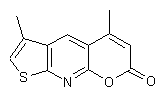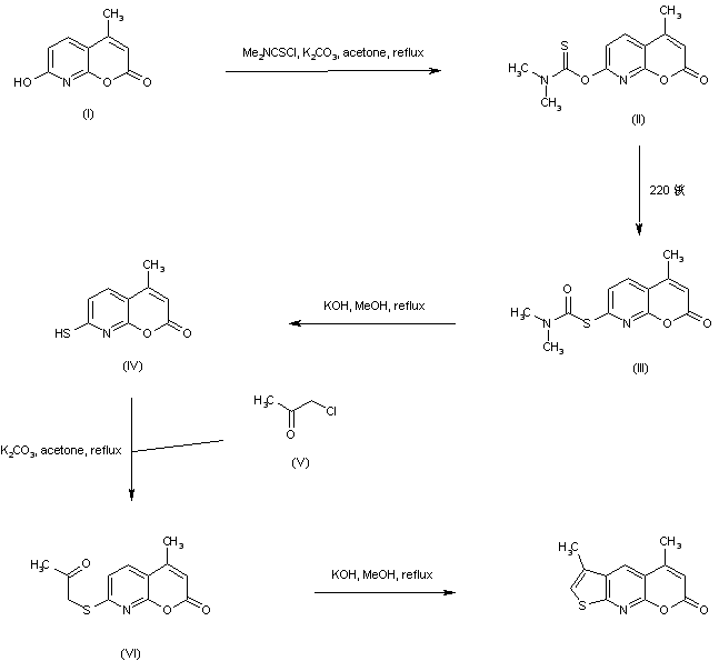 Condensation of 4-methyl-7-hydroxypyrano[2,3-b]pyridin-2-one (I) with N,N-dimethylthiocarbamoyl chloride gives the thiocarbamate (II), which undergoes thermal rearrangement at 220 C to the S-aryl thiocarbamate isomer (III). Subsequent alkaline hydrolysis of (III) provides the 7-mercapto azacoumarin (IV). Alkylation of (IV) with chloroacetone (V) affords thioether (VI). This compound is finally cyclized to the target pyranothienopyridine compound under alkaline conditions.