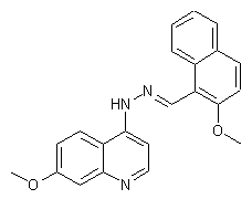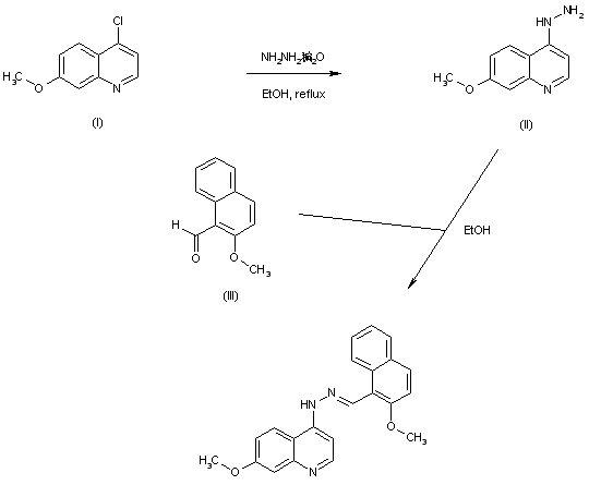 Reaction of 7-methoxy-4-chloroquinoline (I) with hydrazine affords the hydrazino quinoline (II). This is then condensed with 2-methoxy-1-naphthaldehyde (III) to produce the title hydrazone.