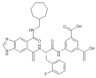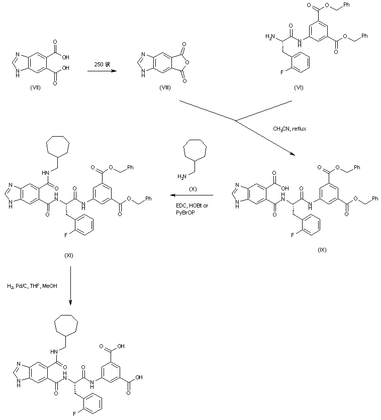 Thermal dehydration of benzimidazole-5,6-dicarboxylic acid (VII) provides the cyclic anhydride (VIII). Subsequent condensation of (VIII) with amine (VI) leads to the amido-acid (IX), which is further coupled to cycloheptylmethylamine (X), yielding the benzimidazole dicarboxamide (XI). Finally, catalytic hydrogenolysis of the benzyl ester groups of (XI) affords the target isophthalic acid derivative. (1,2)