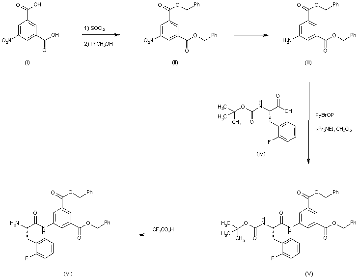 5-Nitroisophthalic acid (I) is converted into the dibenzyl ester (II) via activation with SOCl2. After nitro group reduction in (II), the resultant amine (III) is coupled with N-Boc-L-2-fluorophenylalanine (IV) by means of PyBrOP and DIEA to furnish amide (V). Subsequent acidic cleavage of the N-Boc protecting group of (V) provides amine (VI). (1)
