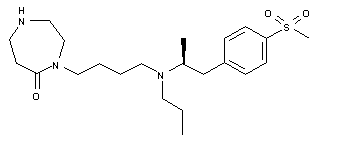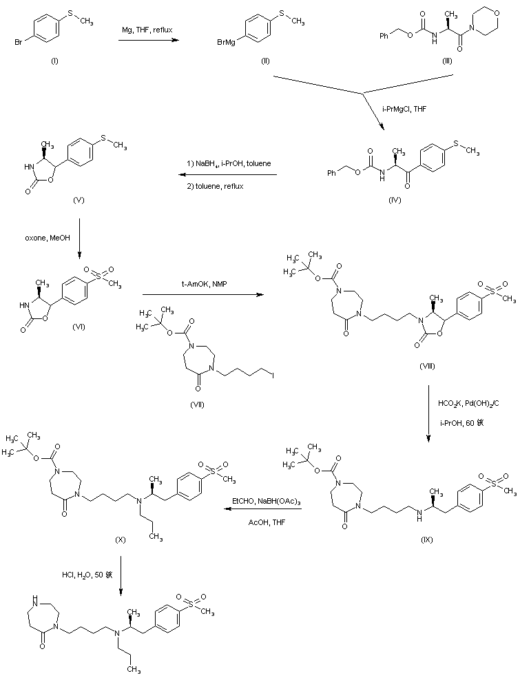 4-Bromothioanisole (I) is converted into the corresponding Grignard reagent (II), which is subsequently condensed with N-Cbz-alanine morpholide (III) to furnish the N-Cbz aminoketone (IV). Keto group reduction in (IV) by means of NaBH4, followed by intramolecular cyclization in boiling toluene leads to the chiral oxazolidinone (V). After oxidation of the methylsulfanyl group of (V) to the corresponding sulfone (VI), N-alkylation with the iodobutyl diazepinone (VII) in the presence of potassium tert-amyloxide furnishes adduct (VIII). The oxazolidinone ring of (VIII) is then subjected to reductive cleavage under transfer hydrogenation conditions to produce the secondary amine (IX). Conversion of amine (IX) into the N-propyl derivative (X) is effected by reductive alkylation with propionaldehyde in the presence of NaBH(OAc)3. The N-Boc group of (X) is finally cleaved under acidic conditions to afford the title compound.