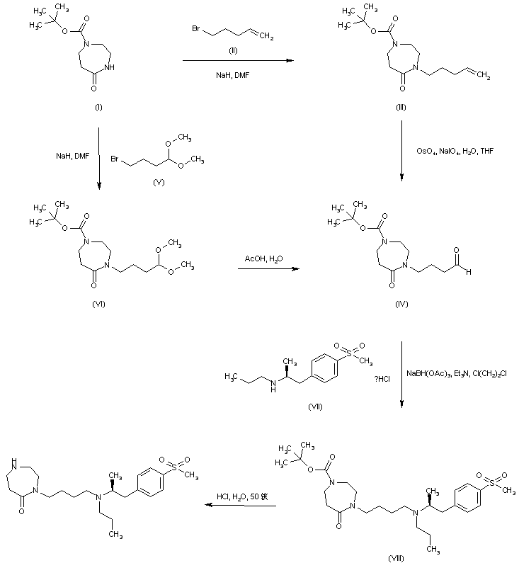 Alkylation of 1-Boc-1,4-diazepine-5-one (I) with 5-bromo-1-pentene (II) in the presence of NaH provides the N-pentenyl diazepinone (III). Subsequent oxidative cleavage of the olefin double bond by means of NaIO4 in the presence of a catalytic amount of OsO4 furnishes aldehyde (IV). Alternatively, alkylation of diazepinone (I) with 4-bromo-1,1-dimethoxybutane (V) yields acetal (VI), which is further hydrolyzed to aldehyde (IV) in aqueous AcOH. Reductive amination of aldehyde (IV) with (S) N-propyl-2-(4-methanesulfonylphenyl)-1-methylethylamine (VII) leads to the tertiary amine (VIII). The N-Boc protecting group of (VIII) is finally cleaved by heating in 6 N HCl.