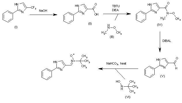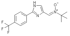 The hydrolysis of 2-phenyl-4-(trifluoromethyl)-1H-imidazole (I) with 1N NaOH gives 2-phenyl-1H-imidazole-4-carboxylic acid (II), which is condensed with N,O-dimethylhydroxylamine (III) by means of TBTU and DIEA in dichloromethane to yield the amide (IV). The reduction of (IV) with DIBAL in THF affords 2-phenyl-1H-imidazole-4-carbaldehyde (V), which is finally condensed with N-tert-butylhydroxylamine (VI) by means of NaHCO3 in hot ethanol to provide the target nitrone.