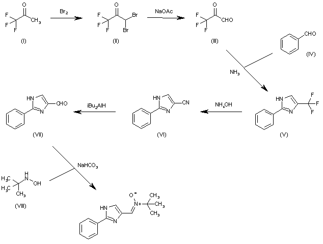 The bromination of 1,1,1-trifluoroacetone (I) according to McBee and Burton gives 3,3-dibromo-1,1,1-trifluoroacetone (II), which is hydrolyzed with aqueous NaOAc to the glyoxal (III). The cyclization of (III) with benzaldehyde (IV) and ammonia in methanol yields 2-phenyl-4-(trifluoromethyl)-1H-imidazole (V), which is converted into the carbonitrile (VI) by reaction with hot aqueous ammonium hydroxide. The reduction of (VI) with diisobutylaluminum hydride in THF affords the carbaldehyde (VII), which is finally condensed with N-tert-butylhydroxylamine (VIII) by means of NaHCO3 in hot ethanol.