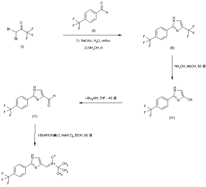 1,1-Dibromo-3,3,3-trifluoroacetone (I) is treated with a hot aqueous solution of sodium acetate, and subsequently condensed with 4-(trifluoromethyl)benzaldehyde (II) in the presence of ammonium hydroxide to furnish the trifluoromethyl imidazole (III). The imidazole trifluoromethyl group of (III) is then selectively converted to nitrile (IV) upon heating with a methanolic solution of ammonium hydroxide. Reduction of the cyano group of (IV) employing DIBAL in cold THF leads to aldehyde (V). This is finally converted to the target nitrone by condensation with N-tert-butyl hydroxylamine.