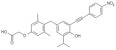 Metalation of the biarylmethane derivative (I) by means of butyllithium, followed by iodination with N-iodosuccinimide, leads to aryl iodide (II). After desilylation of (II) using tetrabutylammonium fluoride, the resultant phenolic compound (III) is alkylated with methyl bromoacetate (IV) to produce ether (V). Palladium-catalyzed coupling between aryl iodide (V) and the phenylethynyl boronate reagent (VI) furnishes the diaryl acetylene (VII). The amino group of (VII) is oxidized to the corresponding nitro derivative employing m-chloroperbenzoic acid, and the methoxymethyl protecting group is then removed by acidic hydrolysis to afford (VIII). Finally, methyl ester hydrolysis in (VIII) in the presence of LiOH gives the target carboxylic acid.