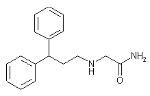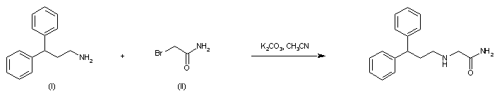 The title compound is prepared by alkylation of 3,3-diphenylpropylamine (I) with bromoacetamide (II) in the presence of K2CO3 in acetonitrile (1).