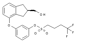 The reduction of 4-hydroxyindane-2-carboxylic acid ethyl ester (I) by means of LiAlH4 in THF gives the hydroxymethyl derivative (II), which is condensed with 3-fluoronitrobenzene (III) by means of K2CO3 in DMF to yield the diaryl ether (IV). The reduction of the nitro group of (IV) by means of H2 over Pd/C in THF/methanol affords the aniline derivative (V), which is treated with NaNO2 and H2SO4 and heated at 100 C to provide the phenol (VI). The condensation of (VI) with 4,4,4-trifluorobutylsulfonyl chloride (VII) by means of t-BuOK in THF leads to the racemic sulfonate (VIII), which is finally submitted to optical resolution by preparative chiral HPLC over Chiracel OD to furnish the target (R)-enantiomer.