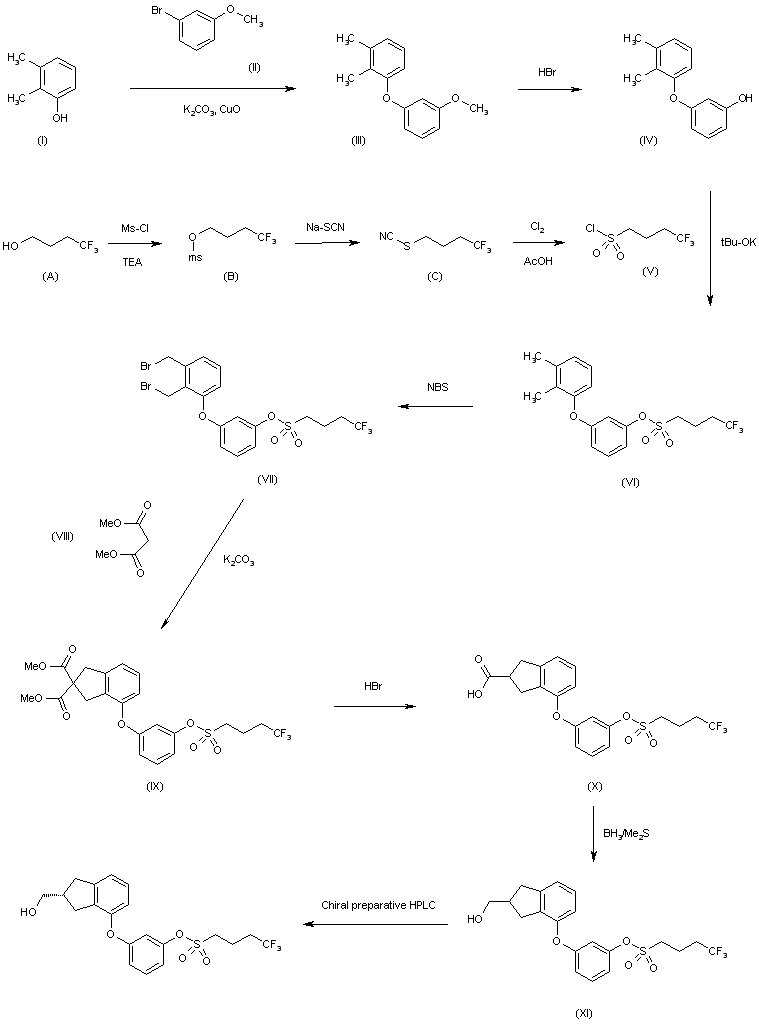 The condensation of 2,3-dimethylphenol (I) with 3-bromoanisole (II) by means of K2CO3 and CuO in pyridine gives the diaryl ether (III), which is demethylated by means of HBr in refluxing acetic acid to yield the phenol (IV). The condensation of (IV) with 4,4,4-trifluorobutylsulfonyl chloride (V) by means of t-BuOK in THF affords the sulfonate (VI), which is brominated by means of NBS in refluxing CCl4 to provide the bis(bromomethyl)compound (VII). The cyclization of (VII) with dimethyl malonate (VIII) by means of K2CO3 in refluxing butanone furnishes the indane-dicarboxylate (IX), which is hydrolyzed and monodecarboxylated by means of HBr in refluxing acetic acid/water to give the indane-carboxylic acid (X). The reduction of the CO2H group of (X) by means of BH3/Me2S in THF yields the racemic hydroxymethyl derivative (XI), which is finally submitted to optical resolution by means of chiral preparative HPLC over Chiracel OD to provide the target (R)-enantiomer.