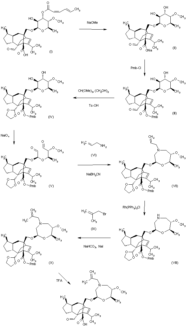 The hydrolysis of Zofimarin (I) with NaOMe in methanol gives the sodium salt of the deacylated compound (II), which is treated with Pmb-Cl in DMF to yield the p-methoxybenzyl ester (III). The protection of the formyl group of (III) by means of ethyleneglycol, trimethyl orthoformate and TsOH affords the ethylene ketal (IV), which is oxidized at the vicinal diol group by means of NaIO4 in methanol/water to provide the dialdehyde (V). The reductocyclization of (V) with allylamine (VI) by means of NaBH3CN and AcOH in acetonitrile leads to the perhydro oxazepine derivative (VII), which is deallylated by means of Rh(PPh3)3Cl in aqueous ethanol to give compound (VIII). The alkylation of (VIII) with 2-methylallyl bromide (IX) by means of NaHCO3 and NaI in ethanol yields the protected precursor (X), which is finally treated with TFA in dichloromethane to provide the target zofimarin derivative.