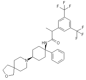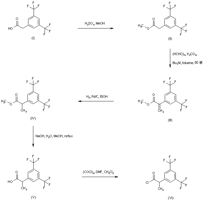 Esterification of 3,5-bis(trifluoromethyl)phenylacetic acid (I) by means of methanolic H2SO4 gives methyl ester (II). Aldol condensation of ester (II) with paraformaldehyde in the presence of K2CO3 and tetrabutylammonium iodide leads to the aryl acrylic acid derivative (III), which is further hydrogenated to the arylpropionic analogue (IV) by using Pd/C. Saponification of the methyl ester group of (IV) affords acid (V). This is then activated as the corresponding acid chloride (VI) upon treatment with oxalyl chloride in the presence of a catalytic amount of DMF.