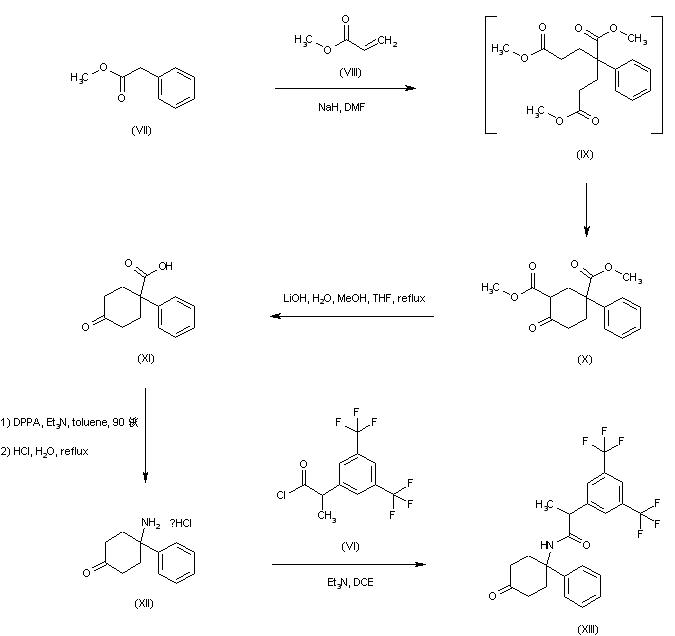 Michael addition of methyl acrylate (VIII) to methyl phenylacetate (VII) in the presence of NaH produces the intermediate triester (IX) which, under the reaction conditions, undergoes Dieckmann cyclization to the cyclohexanone diester (X). Hydrolysis and decarboxylation of keto diester (X) leads to keto acid (XI). This is then subjected to Curtius rearrangement in the presence of diphenylphosphoryl azide (DPPA) to yield, after acidic hydrolysis of the intermediate isocyanate, the amino cyclohexanone (XII). Acylation of amine (XII) by acid chloride (VI) then gives amide (XIII).