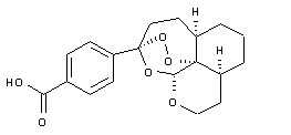 Michael addition of acrylonitrile to the enamine resultant from cyclohexanone (I) and pyrrolidine, followed by alkylation with ethyl bromoacetate, leads to the cyano ester (II). Subsequent Wittig reaction of (II) with methoxymethylene triphenylphosphorane affords the enol ether (III). The ester group of (III) is then reduced to alcohol (IV) using L-selectride. Further intramolecular cyclization of (IV) under acidic conditions gives rise to the bicyclic compound (V). Lithiation of p-bromostyrene (VI) with tert-butyllithium, followed by addition to nitrile (V) produces the ketone adduct (VII). Photooxygenation of (VII), followed by cyclization in the presence of trimethylsilyl triflate, furnishes the fused trioxane derivative (VIII). Finally, oxidative cleavage of the vinyl group of (VIII) with potassium permanganate yields the target carboxylic acid.