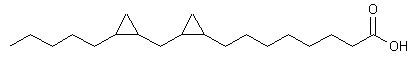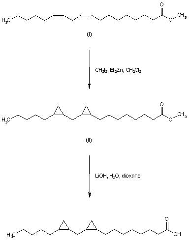 Cyclopropanation of linoleic acid methyl ester (I) employing diiodomethane and diethylzinc gives rise to cis-cyclopropane derivative (II) as a mixture of diastereoisomers. Subsequent hydrolysis of ester (II) with LiOH in aqueous dioxane provides the desired carboxylic acid. (1,2)