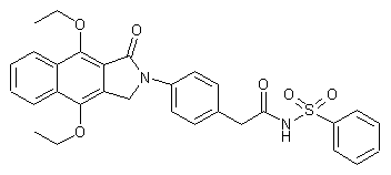 Claisen condensation between diethyl phthalate (I) and diethyl succinate (II) in the presence of NaOEt gives rise to the naphthalenedicarboxylate (III). Alkylation of the phenolic hydroxyl groups of (III) with iodoethane under Williamsom's ether synthesis conditions furnishes the diethoxy napthalenedicarboxylate (IV). Then, alkaline hydrolysis of diester (IV) affords diacid (V), which is further converted to the cyclic anhydride (VI) upon treatment with SOCl2. Condensation of anhydride (VI) with ethyl p-aminophenylacetate (VII) in boiling AcOH leads to the cyclic imide (VIII). Partial reduction of (VIII) with Zn/AcOH produces lactam (IX). The ethyl ester group of (IX) is then selectively hydrolyzed under alkaline conditions to furnish acid (X). Finally, CDI-mediated coupling of acid (X) with benzesulfonamide yields the target N-acyl sulfonamide.