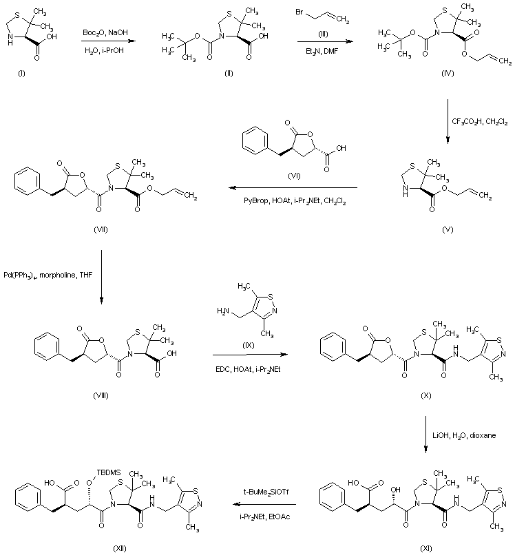 5,5-Dimethylthiazolidine-4-carboxylic acid (I) is protected as the N-Boc derivative (II), and subsequently treated with allyl bromide (III) and triethylamine to form the allyl ester (IV). Acidic Boc group cleavage in (IV) provides amino ester (V), which is further coupled to the lactone acid (VI) to furnish amide (VII). The allyl ester group of (VII) is then removed by treatment with morpholine and Pd(PPh3)4, yielding acid (VIII). This is then coupled to (3,5-dimethylisothiazol-4-yl)methyl amine (IX) employing EDC/HOAt to afford the corresponding amide (X). Lactone ring opening in (X) by hydrolysis with LiOH gives rise to the hydroxy acid (XI), which is further protected as the silyl ether (XII) employing t-butyldimethylsilyl triflate.