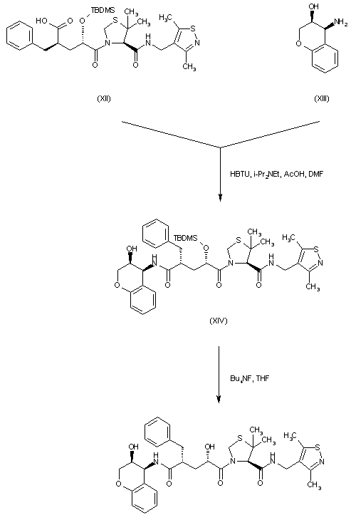 Coupling of acid (XII) with (S,S)-4-aminochroman-3-ol (XIII) in the presence of HBTU provides amide (XIV). Finally, desilylation of (XIV) with tetrabutylammonium fluoride gives rise to the target compound.