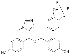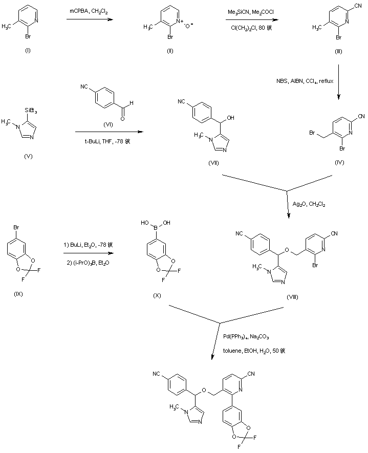 2-Bromo-3-methylpyridine (I) is converted to the corresponding N-oxide (II) by treatment with m-chloroperbenzoic acid in CH2Cl2. Reaction of N-oxide (II) with trimethylsilyl cyanide and dimethylcarbamoyl chloride gives rise to the 2-cyanopyridine (III). Subsequent radical bromination of (III) using NBS and AIBN affords the bromomethyl pyridine (IV). Lithiation of 1-methyl-2-(triethylsilyl)imidazole (V), followed by condensation with 4-cyanobenzaldehyde (VI), provides carbinol (VII). This is then condensed with bromide (IV) in the presence of Ag2O to give ether (VIII). 5-Bromo-2,2-difluorobenzodioxole (IX) is lithiated with butyllithium in cold Et2O and subsequently treated with triisopropyl borate to afford, after aqueous work-up, the arylboronic acid (X). Finally, Mitsunobu coupling between boronic acid (X) and the bromopyridine (VIII) provides the title compound.