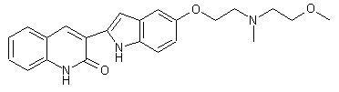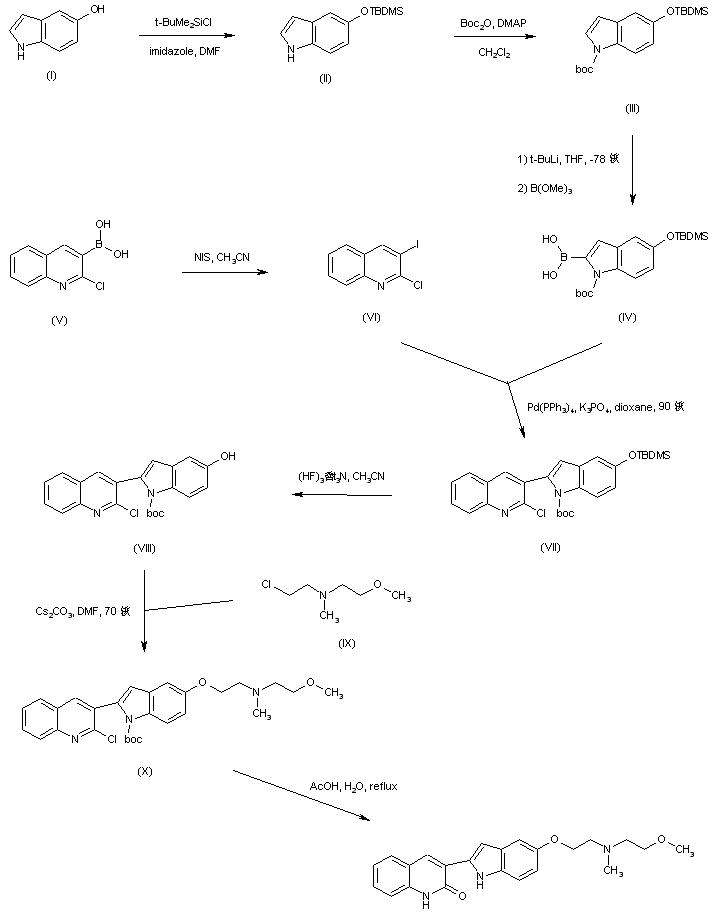 | 合成路线图解说明: 5-Hydroxyindole (I) is sequentially protected at the OH and NH groups to afford the silyl ether (II), and then the N-Boc derivative (III). Metalation of the protected indole (III) by means of tert-butyllithium, followed by reaction with trimethyl borate, provides the boronic acid (IV). Treatment of 2-chloro-3-quinolineboronic acid (V) with N-iodosuccinimide gives rise to 2-chloro-3-iodoquinoline (VI). This is subjected to Suzuki coupling with the indoleboronic acid (IV) to furnish the quinolinyl indole (VII). Desilylation of (VII) using triethylamine trihydrofluoride gives the hydroxy indole (VIII), which is alkylated with the chloro amine (IX) to produce the indolyl ether (X). Finally, hydrolysis of the 2-chloroquinoline moiety of (X) and simultaneous N-Boc group cleavage with 50% HOAc leads to the title compound. |