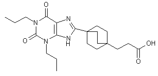 The cyclization of 5,6-diamino-1,3-dipropylpyrimidine-2,4(1H,3H)-dione (I) with bicyclo[2,2,2]octane-1,4-dicarboxylic acid monoethyl ester (II) by means of HATU and TEA in acetonitrile gives the dipropylxanthine derivative (III), which is esterified with MeOH and sulfuric acid, yielding the methyl ester (IV). The reduction of the ester group of (IV) by means of LiBH4 in refluxing THF affords the hydroxymethyl derivative (V), which is oxidized with DMP in dichloromethane to provide the carbaldehyde (VI). The condensation of aldehyde (VI) with phosphonate (VII) by means of KHMDS in toluene leads to the acrylic acid methyl ester (VIII), which is hydrolyzed with LiOH in methanol/water to give the free acid (IX). Finally the double bond of the acrylic moiety is hydrogenated with H2 over Pd/C in methanol to yield the target xanthine derivative.
